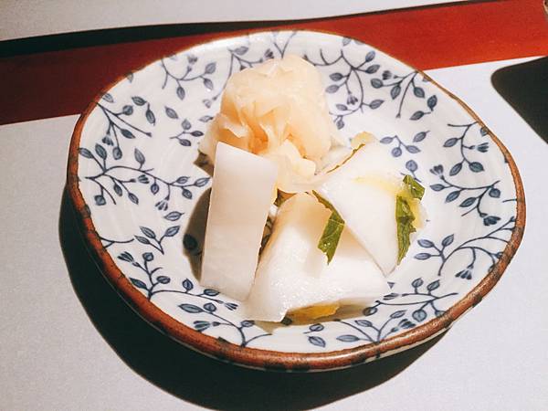 吃完了烤雞腿服務生端上了醃蘿蔔,就知道要進入握壽司盤了(其實並不知道是看到下一道端上來才知XD)。吃了一系列熟食吃幾塊醃蘿蔔可以清清口,魚道生的醃蘿蔔算是口味比較清淡的款式,搭配著紫蘇葉脆脆的好爽口。至於甜薑我是個不敢吃的人就沒有嚐了。