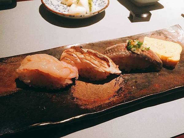 接下來上的一品是本日的心頭好握壽司!由左至右分別是甜蝦、青魽魚佐蟹膏、沙丁魚跟玉子燒。甜蝦有濃郁的甘甜味,肥美新鮮非常好吃。今天很常現身的青魽魚依然不俗,倒是蟹膏的味道沒有很明顯。沙丁魚算是我比較不愛的魚類,總覺得很容易有草腥味,魚道生的沙丁魚不腥,但也沒有到特別愛。玉子燒登場算是今天菜色到一段落的結尾,口感不錯不會太甜。一系列吃下來,雖然不到撐到也頗有飽足感,魚道生上菜的速度比較悠閒,我們從12點半入座吃完了主餐竟然也兩點多了。